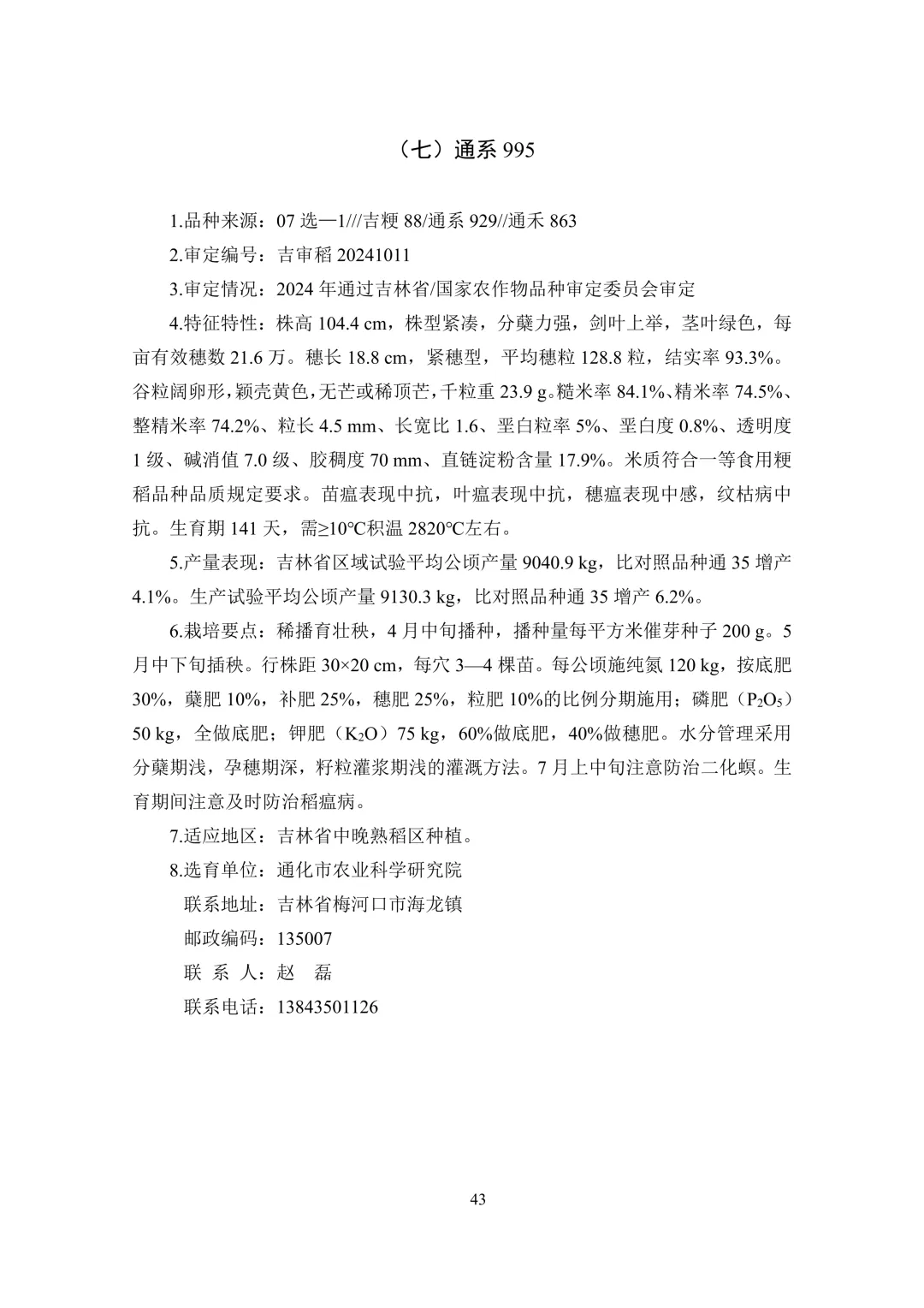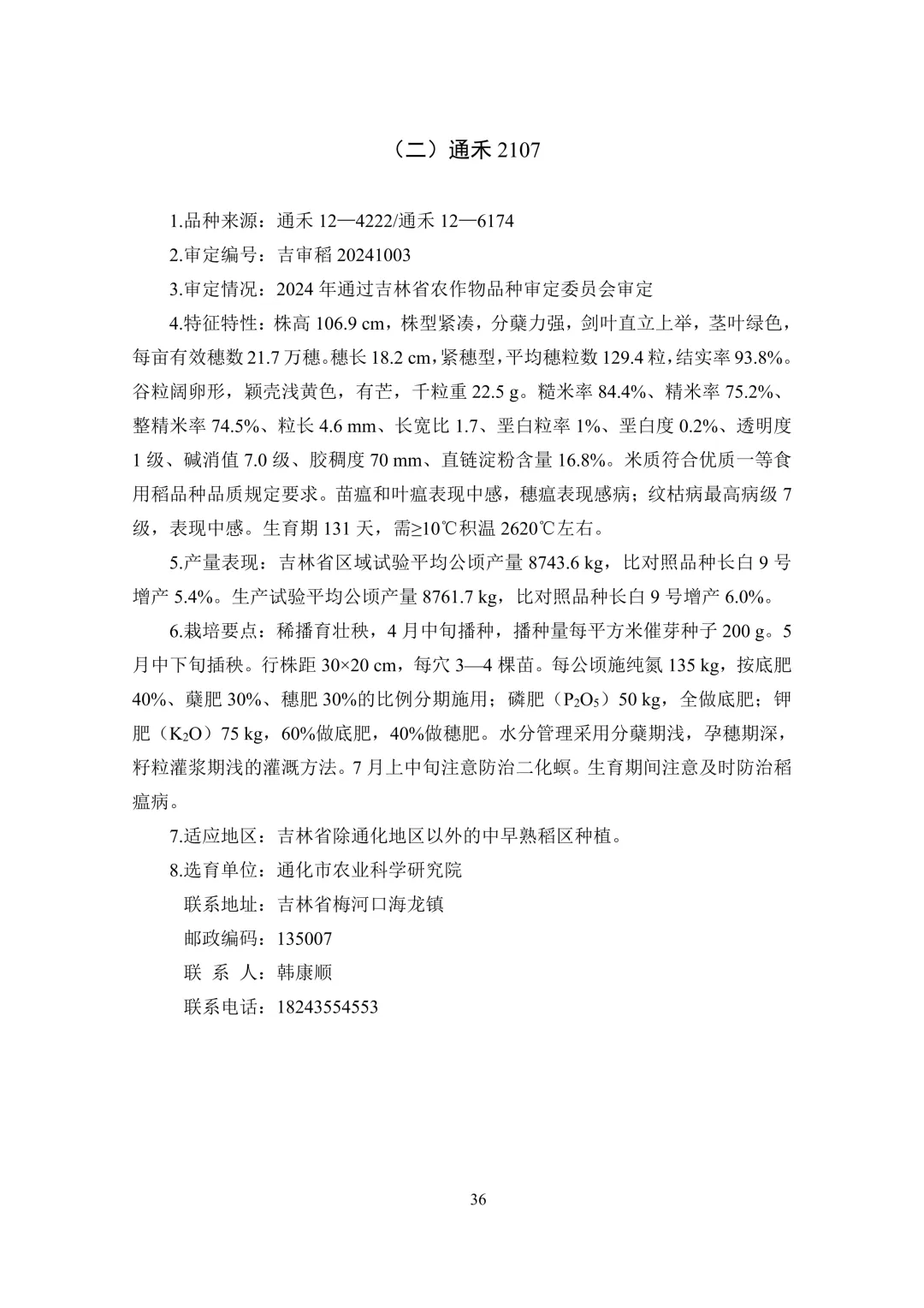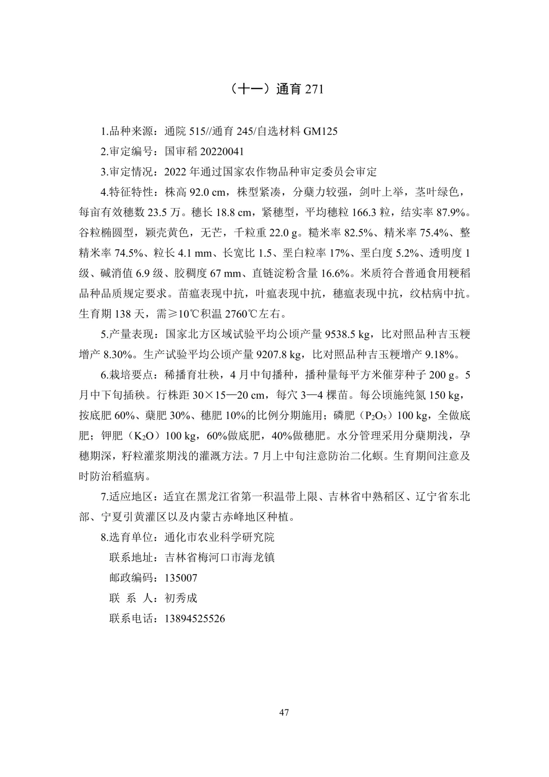 中晚熟区(6 个):通系 995、通禾 8501、吉农大 787、吉 粳 558、通育 271、九稻 87。