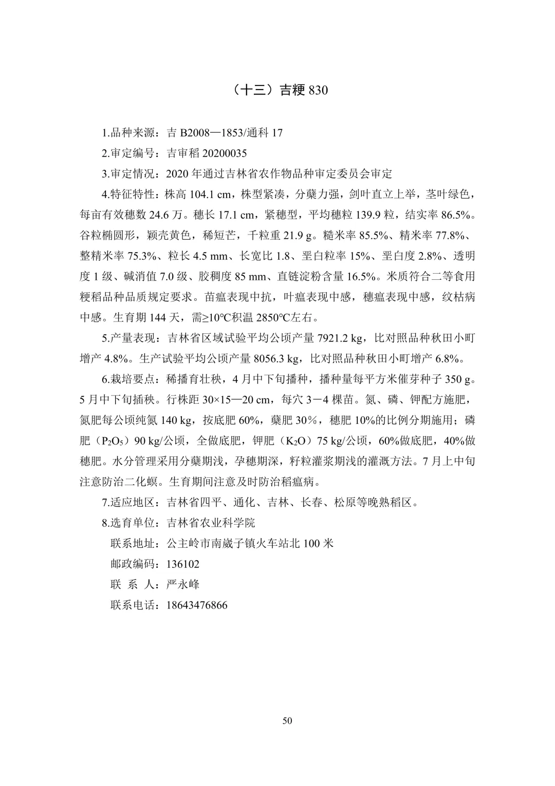 晚熟区(1 个):吉粳 830。