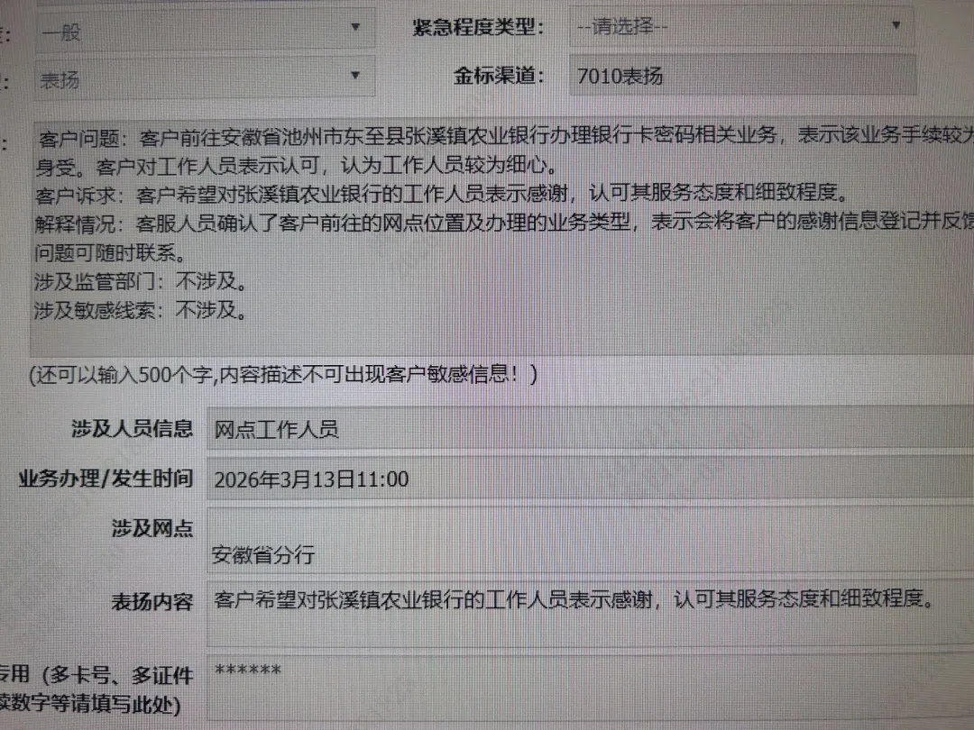 从“扬言曝光”到“致电表扬”,一句“让你行出名”的狠话,最后变成了电话里最暖的表扬,这场180度的反转,正是池州张溪农行“合规为底、服务为暖”的生动注脚。一直以来,池州农行始终以真心换民心,用耐心化难题,在坚守金融底线的同时,把“大行温暖”送到每一位客户的心坎里。