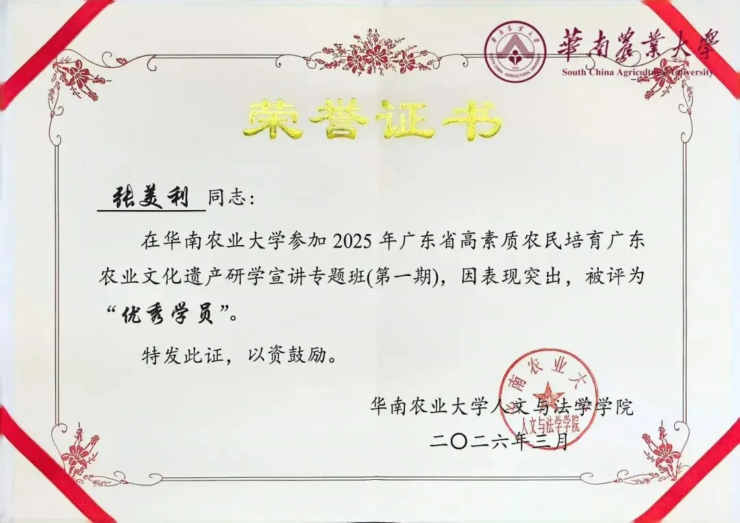 近日,由广东省农业农村厅主办、华南农业大学承办的 2025年广东省高素质农民(乡土文化能人)培育项目——广东农业文化遗产研学宣讲专题班(第一期)圆满结课。