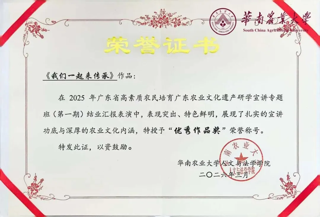 此次获奖,既是对会员们专业能力的肯定,也是华南农业大学校友会文化遗产与传统文化行业联谊会深耕乡村文化建设、助力岭南农业文化遗产传承的有力体现。会员们也表示将把培训所学运用到实际工作中,深挖本土农耕文化价值,讲好岭南乡土故事。