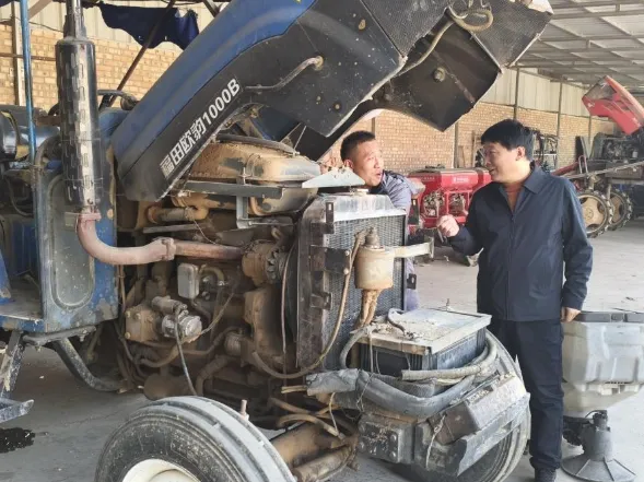在检修现场,技术人员采取“理论宣讲+实操演示”相结合的方式,手把手指导农机手进行机具调试、保养和故障排查。通过“望、闻、问、切”,及时发现并消除安全隐患,确保农机具“不带病”作业,真正做到机具检修全覆盖,不留死角。
