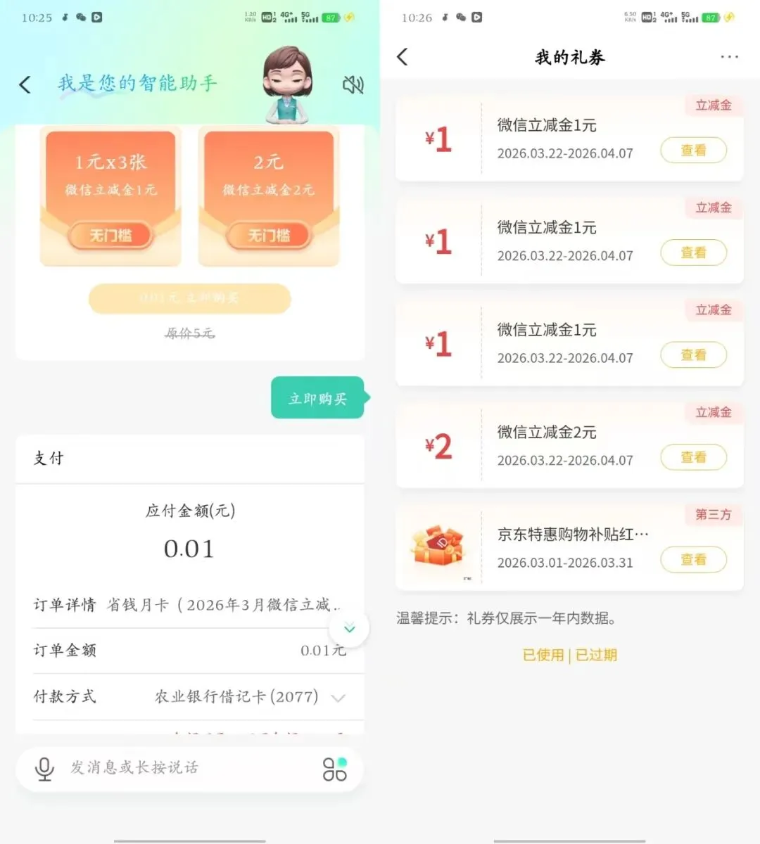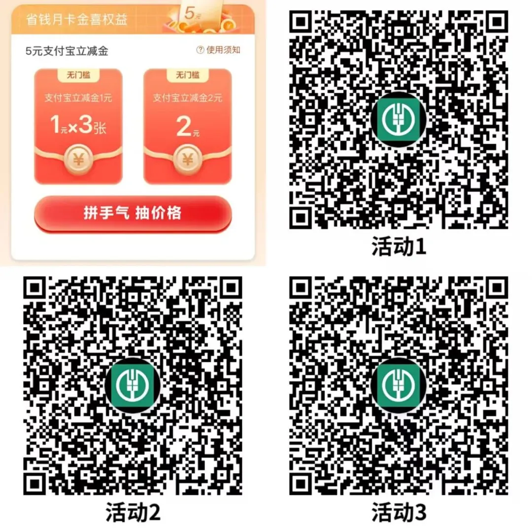 3个活动不冲突!微信打开活动->跳转到农行APP省钱月卡->抽最低0.01亓买5亓立减金[图片]