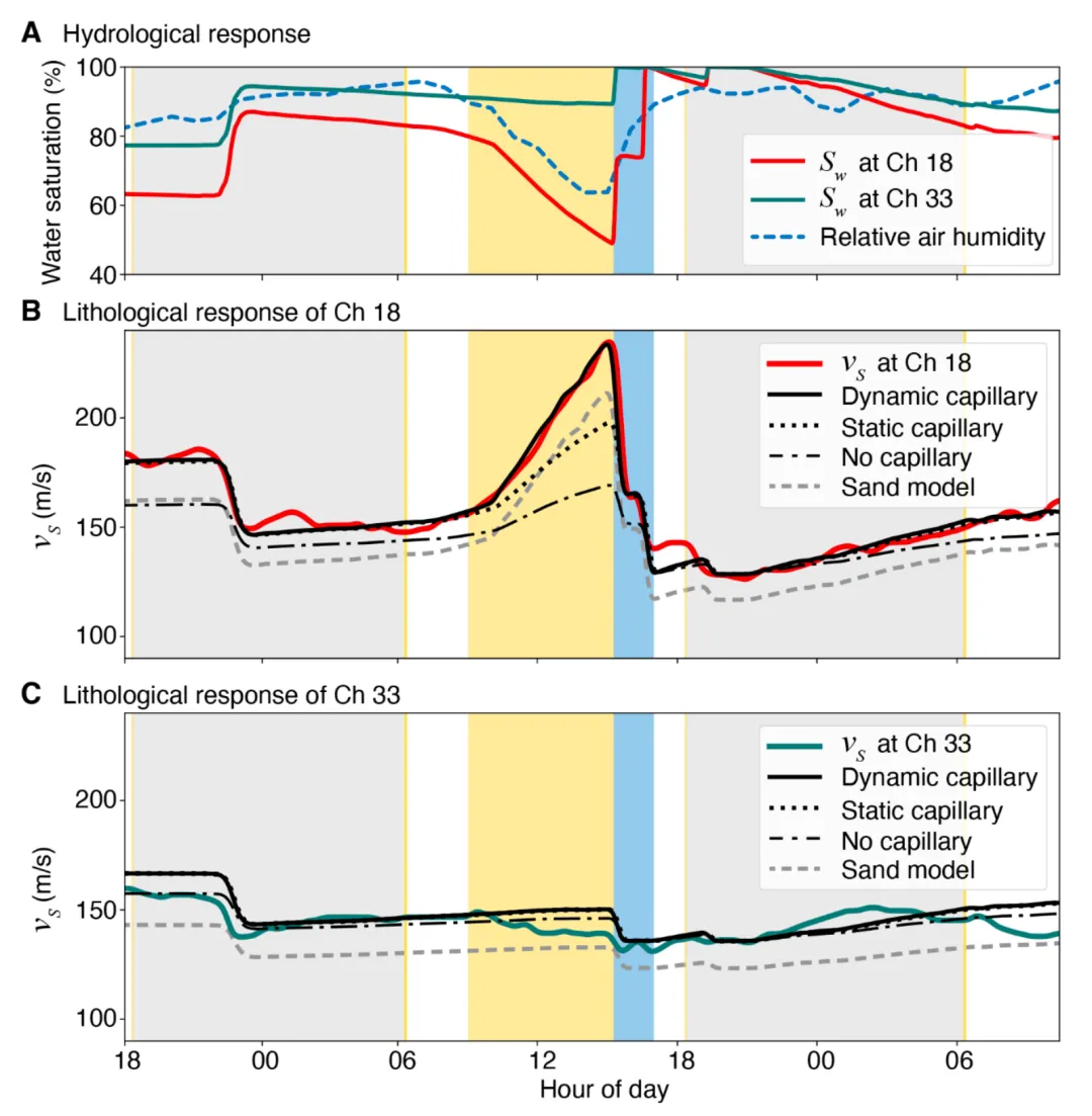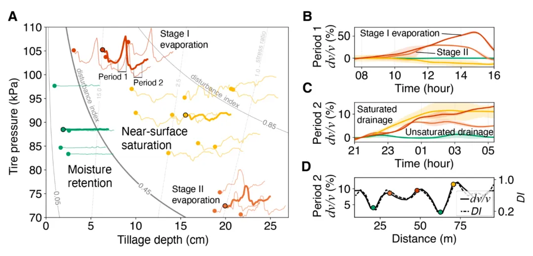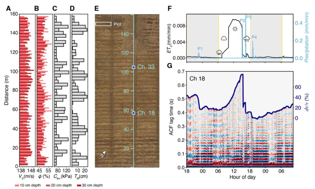 复杂DAS海量数据的深度学习降噪与特征提取 本研究中,DAS 系统以 2kHz 的采样率在 40 小时内产生了极度庞大的原始波形数据,且混合了风声、农机震动等复杂环境噪声。传统的互相关函数(ACF)提取计算成本高昂。深度学习(如一维卷积神经网络 1D-CNN 或 Transformer 架构)可以直接应用于连续的 DAS 应变率数据,在潜空间中自动分离降雨信号、蒸发信号与背景噪声,实现实时、低延迟的土壤剪切波速($v_s$)连续反演,极大降低农业物联网的边缘计算压力。