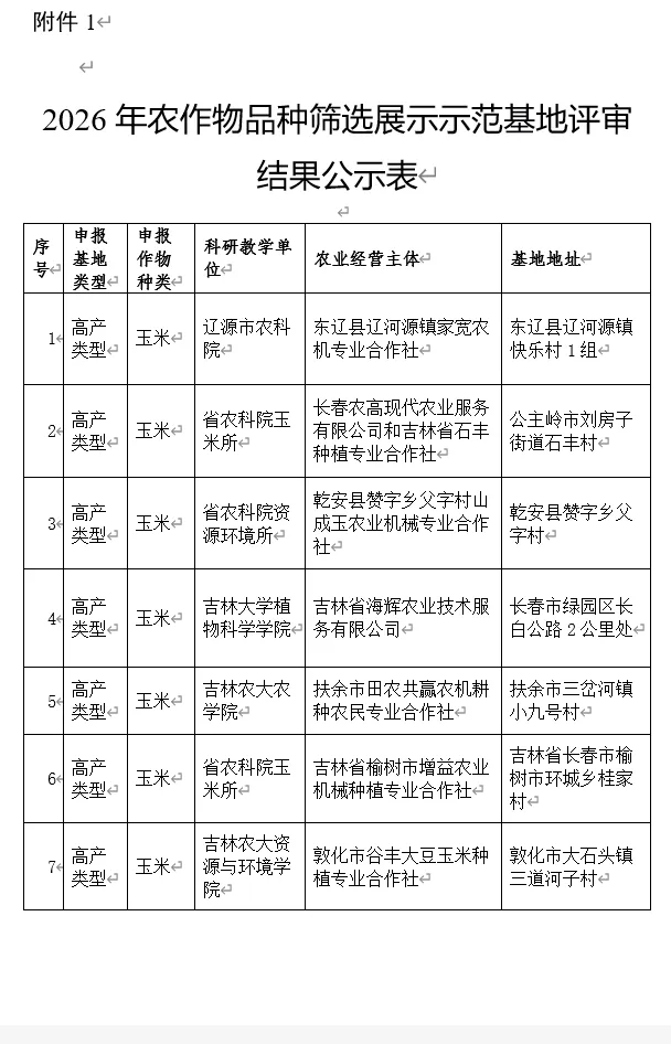 附件:1. 2026年农作物品种筛选展示示范基地评审结果公示表