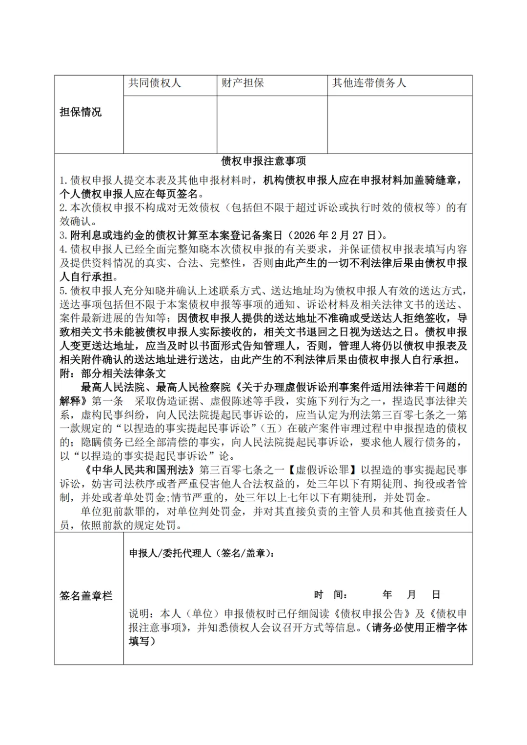 2.机构债权申报人应在上述材料上加盖公章,个人债权申报人应在上述材料上签字并捺手印。二者有委托代理人的,代理人应同时签字并按捺指印。