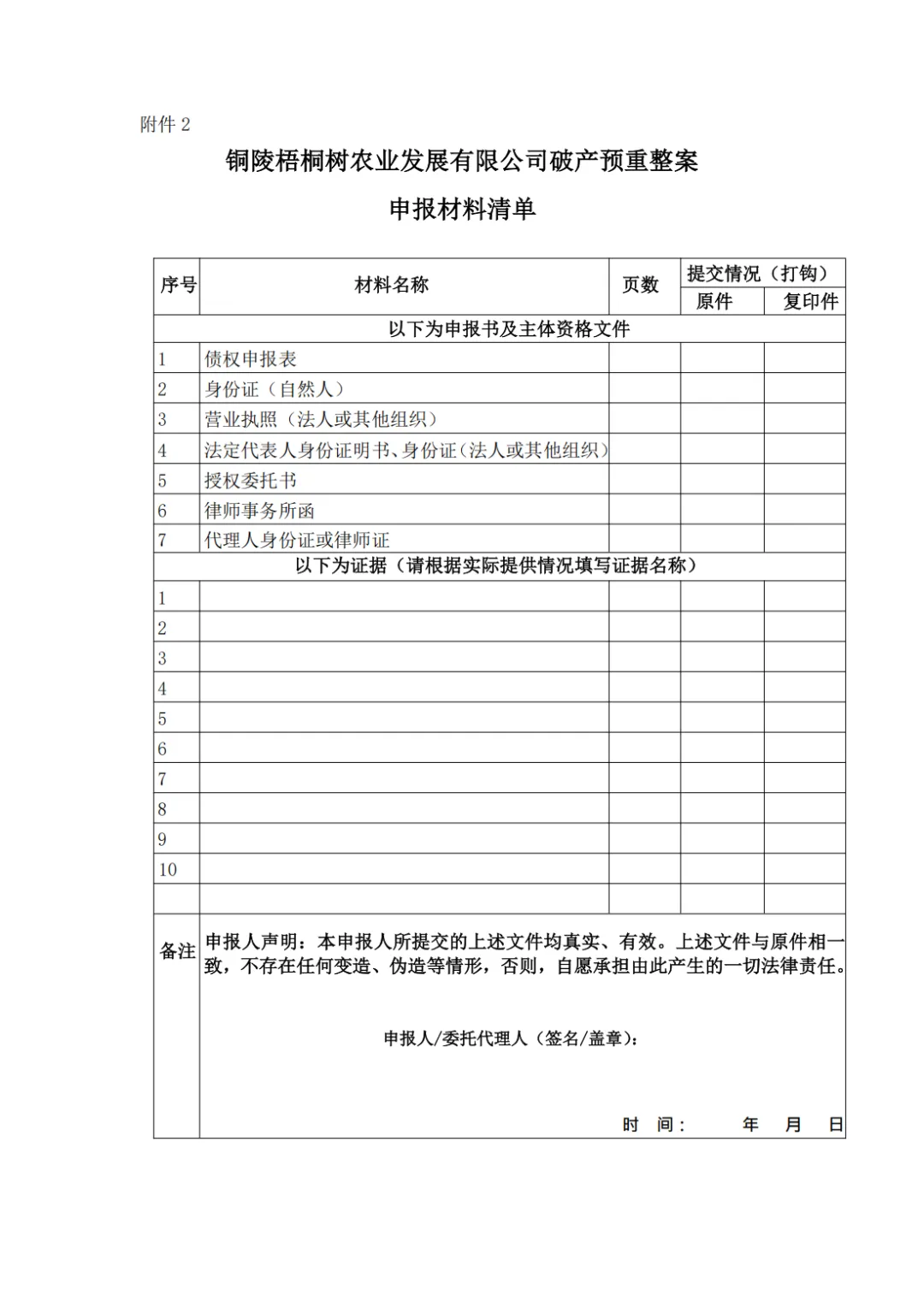 2.债权申报表、申报材料清单、送达地址及收款账户确认书、承诺函、授权委托书、法定代表人或负责人身份证明书必须为原件,其他材料可以提交复印件,但应同时提交原件核对,原件核对无误后予以返还。