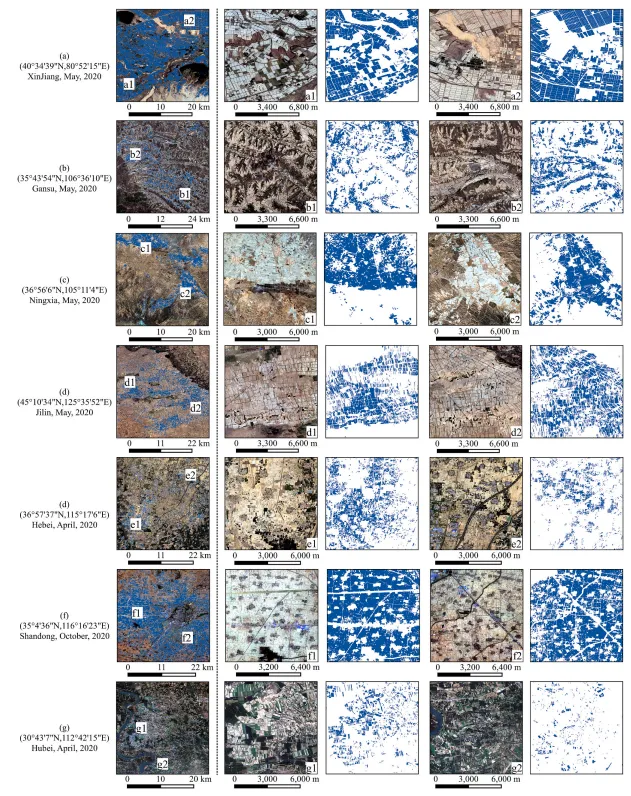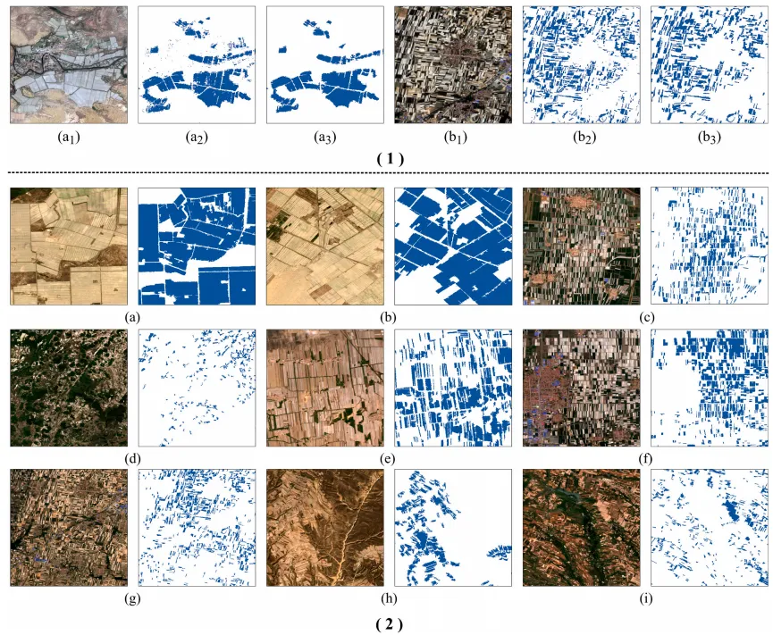 图 5.弱标签(注:图 5.1 展示初始弱标签(图 5.1 a2、b2)与精修后弱标签(图 5.1 a3、b3)。图 5.2 展示不同区域与景观下精修后的塑料大棚农田弱标签,其中蓝色区域为塑料大棚农田,白色区域为背景。)。