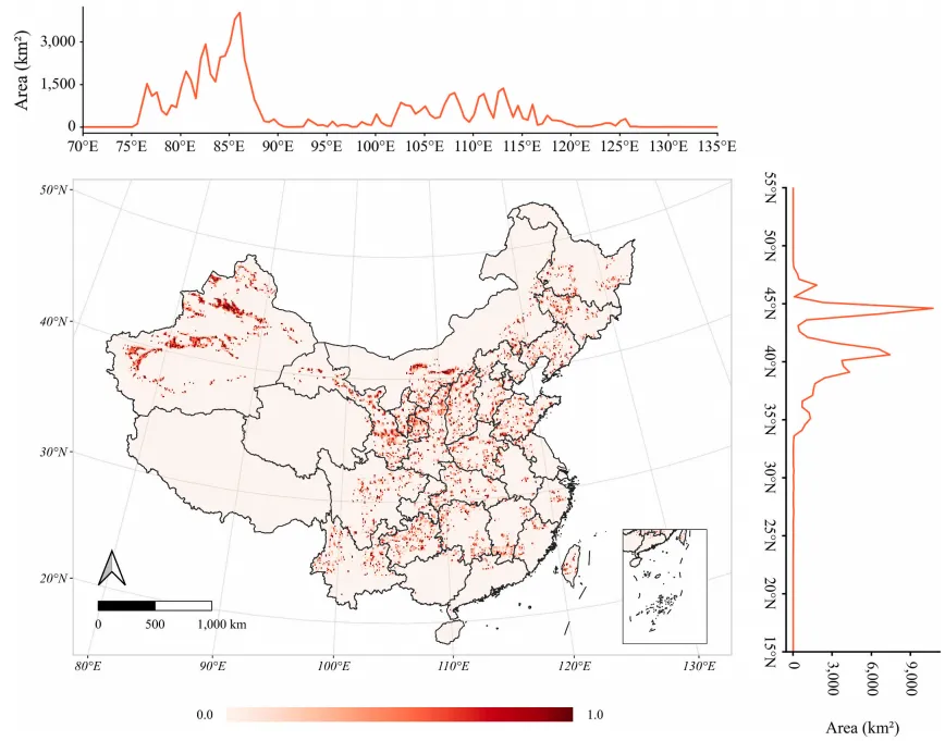 图 9.2020 年中国塑料大棚农田(PMF)空间分布图,地图空间分辨率为 0.1°。