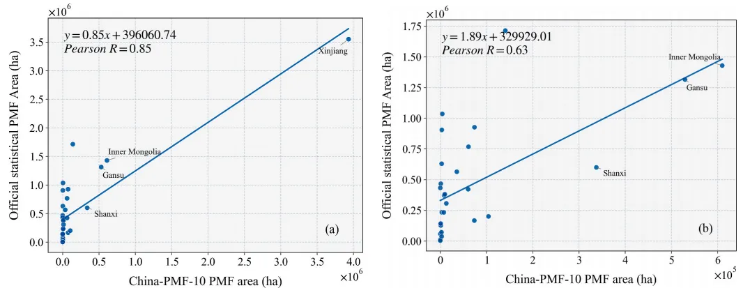 图 13.省级尺度下 China-PMF-10 数据集塑料大棚农田面积估算值与官方统计数据的相关性。