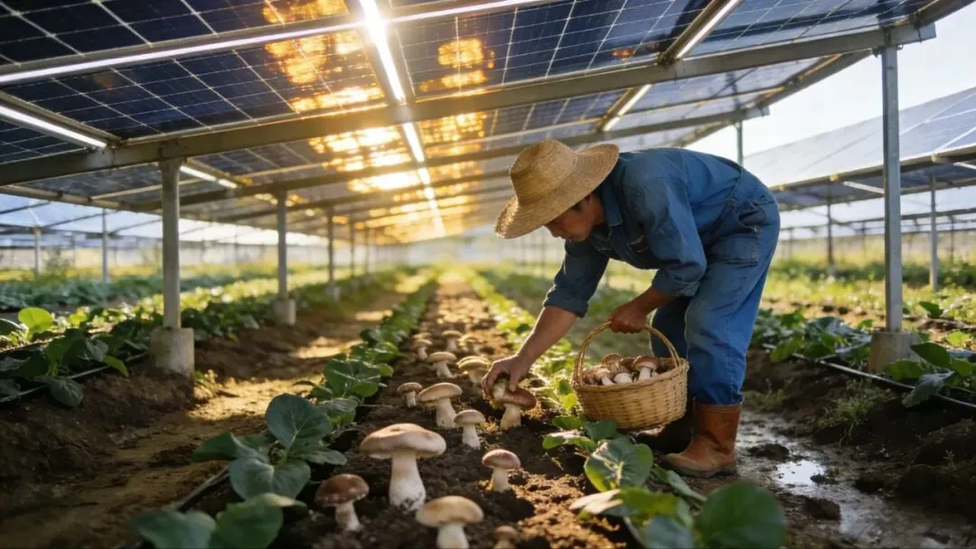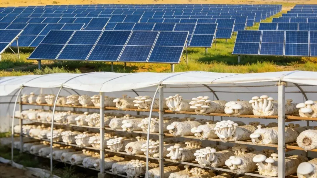 简单说就是光伏板在上面发电,蘑菇在下面生长。