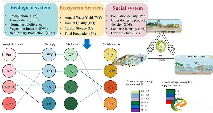 该研究构建了一个以生态系统服务为桥梁的“要素—结构—生态系统网络”分析框架。该框架将生态系统关键要素、生态结构与生态系统服务功能统一纳入网络框架,实现了对社会系统与生态系统复杂相互作用关系的定量表达,系统刻画了河套灌区社会—生态系统的作用关系,突破了单要素分析方式,揭示了生态系统服务供需关系及种植结构在区域演变中的重要作用。