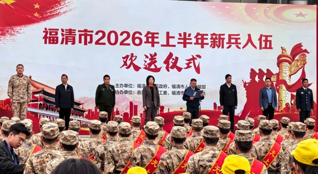 3月19日,福清市2026年春季新兵入伍欢送仪式隆重举行。市、校相关领导出席活动,我院4名学生身披绶带、胸戴红花,光荣入伍;学院辅导员到场欢送,共同见证这一光荣时刻。