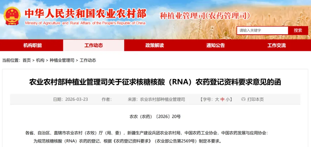 关于征求核糖核酸(RNA)农药登记资料要求意见的函