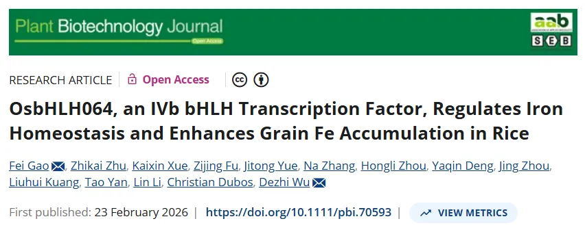 近日,湖南农业大学农学院水稻抗逆遗传改良吴德志教授团队在植物科学领域著名期刊《Plant Biotechnology Journal》(IF5y=12.4)发表题为“OsbHLH064, an IVb bHLH Transcription Factor, Regulates Iron Homeostasis and Enhances Grain Fe Accumulation in Rice”的研究论文,揭示了水稻植株铁稳态及籽粒铁富集的分子机制。