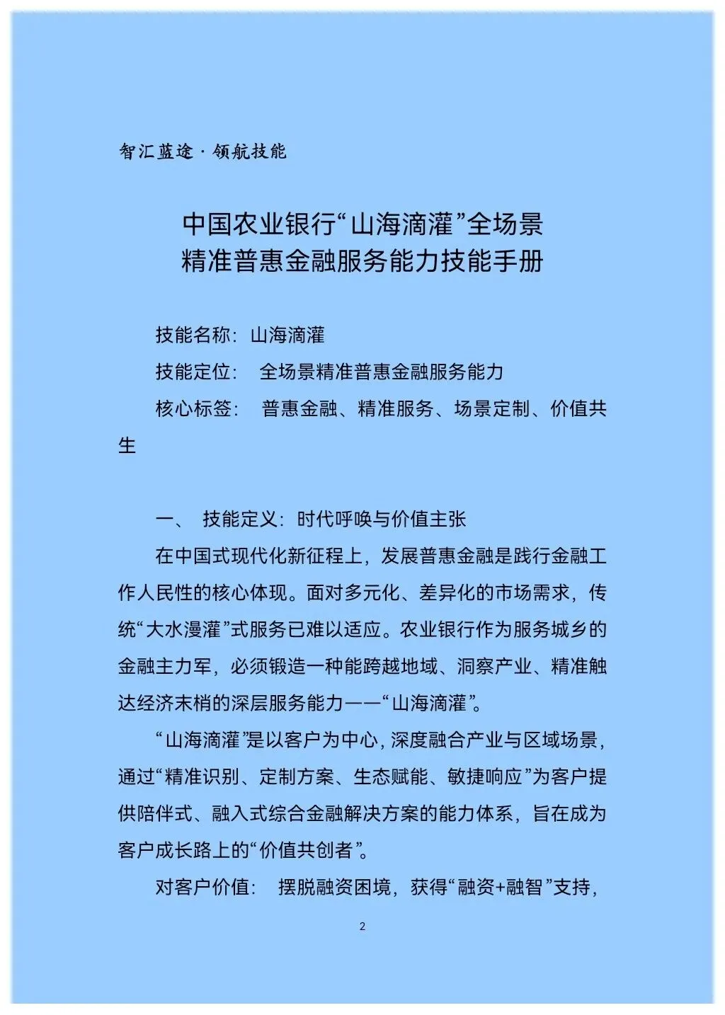 今天,我们怀揣着开放与分享的初心,向您郑重推介中国农业银行锻造的实战智慧结晶——《“山海滴灌”全场景精准普惠金融服务能力技能手册》。这并非一份普通的制度文件,而是一套经过实践淬炼、源于一线、旨在破解上述核心命题的方法论体系与实战锦囊。