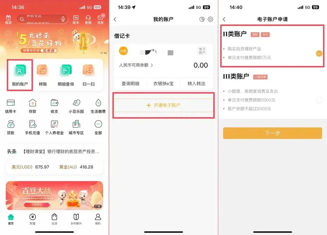 登录农业银行手机银行app,点击首页,进入我的账户--开通电子账户--选择Ⅱ类账户--输入他行卡号(农行卡除外)--拍摄身份证照片(必须原件)--刷脸认证