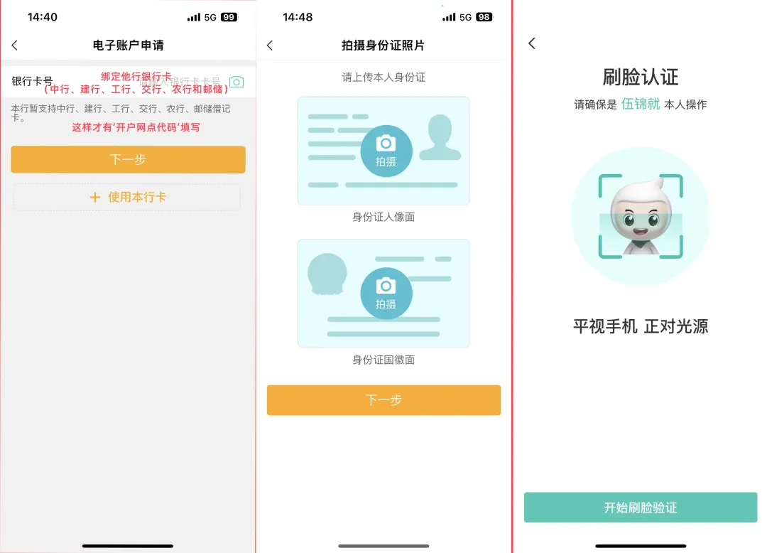 开户必须绑定他行一类卡(中行/工行/建行/邮储/交行),注意不能绑定农行一类卡,且不能是社保卡,社保卡开不出来二类户