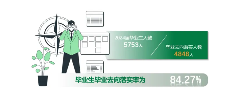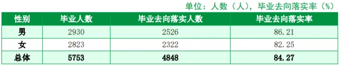 学校2024届共有本科毕业生5753人。2024届毕业生中,男性2930人,占毕业生总人数的50.93%;女性2823人,占毕业生总人数的49.07%。截至2024 年 8月31日,毕业去向落实人数共4848人,总体毕业去向落实率为84.27%。分性别来看,男性毕业生毕业去向落实率为86.21%,女性毕业生毕业去向落实率为82.25%。
