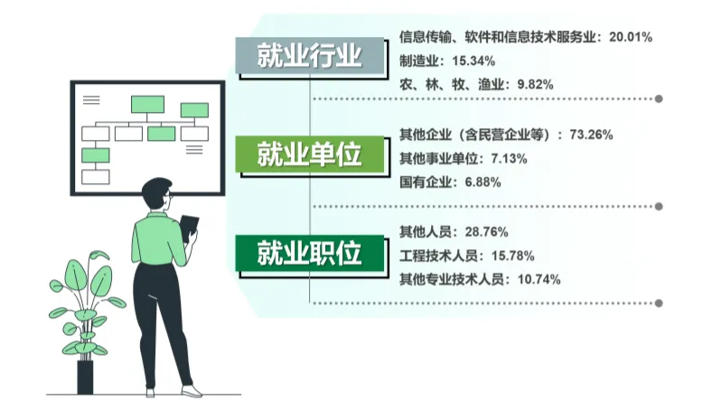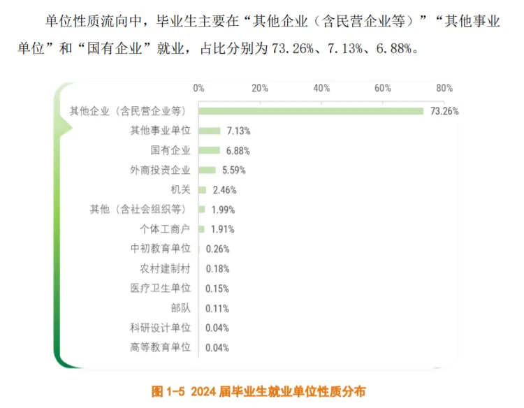 从毕业去向构成来看,2024届毕业生以单位就业为主。具体来看,毕业生单位就业率为50.10%,升学率为32.57%,待就业率为14.41%,暂不就业率为1.32%,自由职业率为1.25%,自主创业率为0.35%。