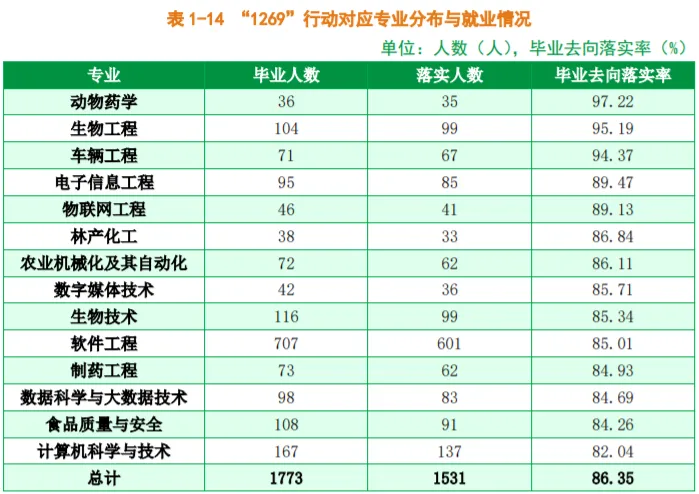 分学院来看,2024届毕业生毕业去向落实率较高的学院是生物科学与工程学院、动物科学技术学院、化学与材料学院,毕业去向落实率分别为 88.74%、88.64%、87.01%。分专业来看,2024届毕业生毕业去向落实率较高的专业是动物药学专业(97.22%)、生物工程专业(95.19%)、车辆工程专业(94.37%)。