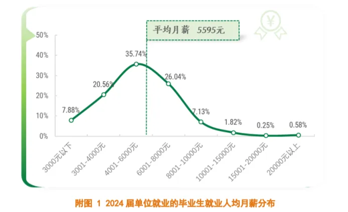 调查数据显示,单位就业毕业生的就业平均月薪为5595元,月薪区间主要集中在4001-6000元(35.74%)。