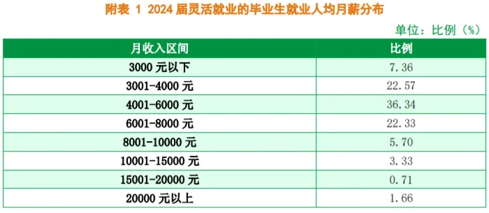调查数据显示,灵活就业毕业生的就业平均月薪为5777元,月薪区间主要集中在4001-6000元(36.34%)。