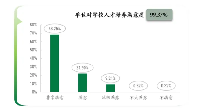 调查显示,用人单位对学校人才培养工作的总体满意度高达 99.37%。由此 可见,学校培养的专业人才高度满足单位用人需求,得到了需求方的高度认可。