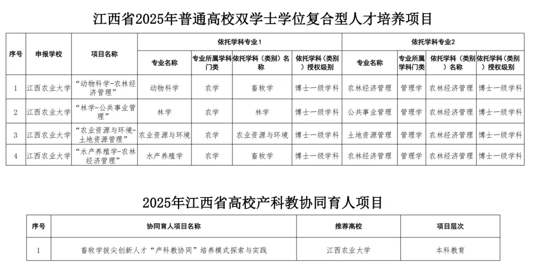 近日,江西农业大学成功获批“动物科学-农林经济管理”等4个双学士学位复合型人才培养项目和1个产科教协同育人项目。