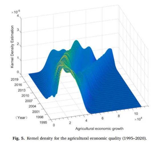 结果表明,农业 GHG 排放上,1995-2015 年持续上升,2015-2020 年略有下降;排放结构由畜禽养殖主导(1995-2007)转为农业用地主导(2007-2020),空间上呈现持续南移趋势,河南、河北先增后降,黑龙江、安徽后期上升;农业能源消费方面1995-2020年波动上升后下降,1997-1999年大幅增长;能源结构中电力占比最大,机械化推进带动化石能源消费增加;农业经济质量:整体呈上升趋势,核密度曲线右移;区域极化现象存在但逐渐缓解,区域差距逐步缩小。