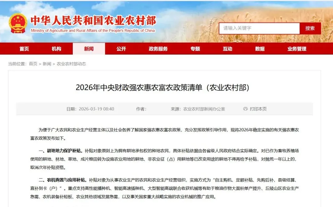 为便于广大农民和农业生产经营主体以及社会各界了解国家强农惠农富农政策,充分发挥政策引导作用,农业农村部近日正式发布《2026年强农惠农富农政策实施清单》,系统梳理粮食生产扶持、农业基础设施建设、乡村特色产业发展等重点政策措施。