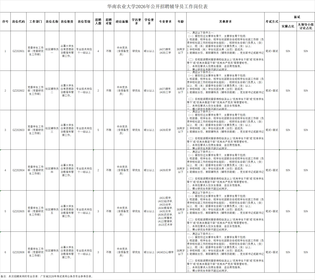 附件:1. 华南农业大学2026年公开招聘辅导员工作岗位表.xls