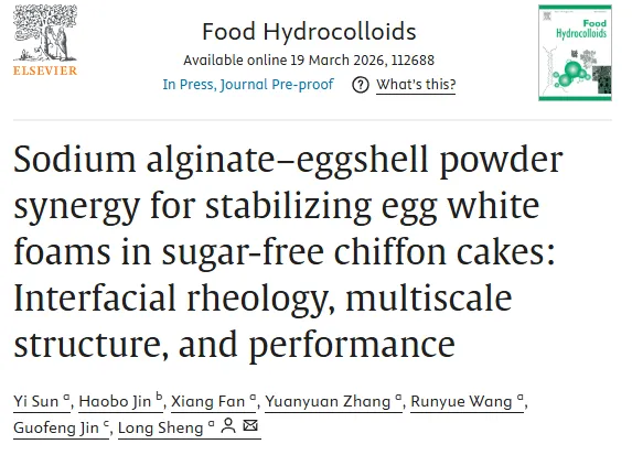 Food Hydrocolloids| 海藻酸钠 - 蛋壳粉协同稳定无糖戚风蛋糕中的蛋清蛋白泡沫:界面流变学、多尺度结构与应用性能