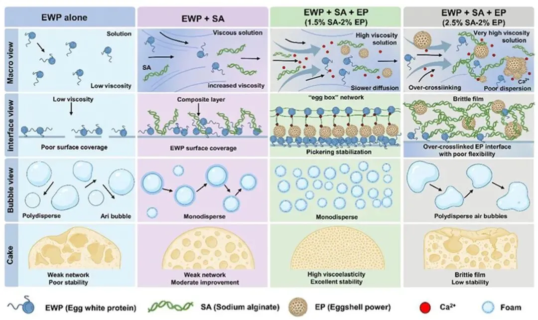 近日,华中农业大学团队在《Food Hydrocolloids》期刊上发表了题为《Sodium alginate–eggshell powder synergy for stabilizing egg white foams in sugar-free chiffon cakes: Interfacial rheology, multiscale structure, and performance》的研究性论文(一区,IF:12.4)。该研究针对无糖戚风蛋糕体系中蛋清蛋白泡沫易失稳的痛点,探究了海藻酸钠(SA)与蛋壳粉(EP)对蛋清蛋白发泡特性的协同调控作用,分析了复配体系对泡沫性能、多尺度结构、界面流变特性及蛋糕品质的影响,揭示了二者可通过蛋白 - 多糖复合、钙离子介导的交联效应及颗粒 Pickering 稳定机制,协同强化泡沫的体相与界面结构,最优配方实现了 100% 的泡沫稳定性,同时显著优化了无糖戚风蛋糕的孔隙结构与质构特性,也为蛋壳副产物的高值化利用提供了可行方案。