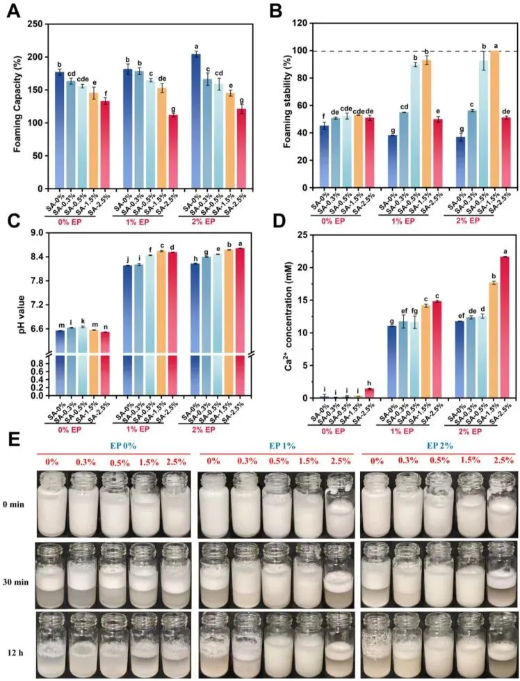 Fig. 1. FC (A), FS (B), pH (C), soluble Ca2+ concentration (D), and representative macroscopic images (E) of EWP dispersions prepared with different SA (0, 0.3, 0.5, 1.5, and 2.5%, w/v) and EP (0, 1, and 2%, w/v) concentrations. Different letters indicate significant differences (P < 0.05).