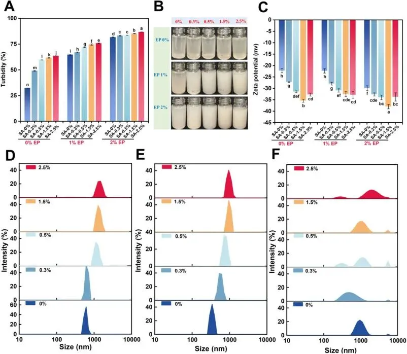 Fig. 2. Turbidity (A), representative macroscopic images of dispersions (B) and zeta potential (C) of EWP dispersions prepared with different SA (0, 0.3, 0.5, 1.5, and 2.5%, w/v) and EP (0, 1, and 2%, w/v) concentrations. Particle size distributions of EWP dispersions prepared with different sodium alginate concentrations (0, 0.3, 0.5, 1.5, and 2.5% w/v) at 0% EP (D), 1% EP (E), and 2% EP (F). Different letters indicate significant differences (P < 0.05).