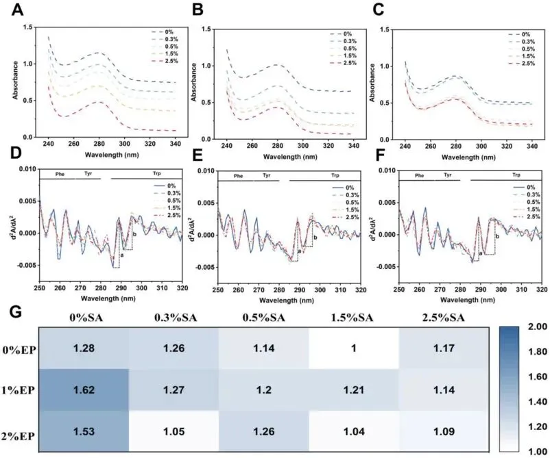 Fig. 3. UV-Vis spectra of EWP dispersions prepared with different sodium alginate (SA) and eggshell powder (EP) concentrations: 0% EP with 0, 0.3, 0.5, 1.5, and 2.5% SA (A); 1% EP with 0, 0.3, 0.5, 1.5, and 2.5% SA (B); and 2% EP with 0, 0.3, 0.5, 1.5, and 2.5% SA (C). Second-derivative UV spectra of the corresponding samples: 0% EP (D), 1% EP (E), and 2% EP (F). Heatmap of the characteristic ratio r values calculated from the second-derivative spectra for all groups (G).