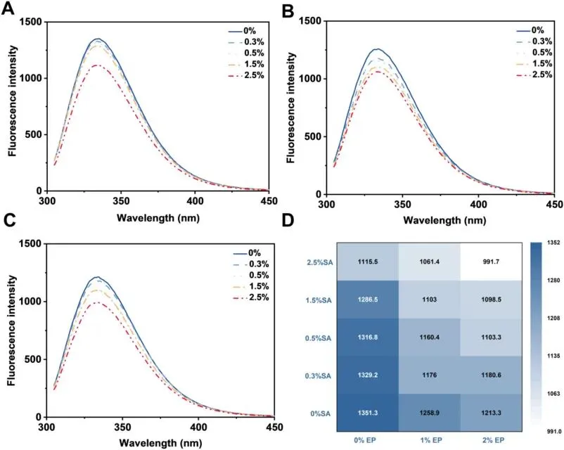 Fig. 4. Intrinsic fluorescence spectra of EWP dispersions prepared with different SA and EP concentrations: 0% EP with 0, 0.3, 0.5, 1.5, and 2.5% SA (A); 1% EP with 0, 0.3, 0.5, 1.5, and 2.5% SA (B); and 2% EP with 0, 0.3, 0.5, 1.5, and 2.5% SA (C). Heatmap summarizing the fluorescence intensity of all groups (D).