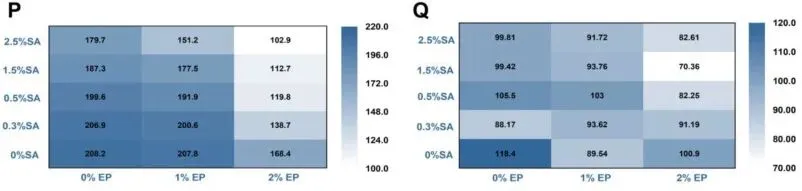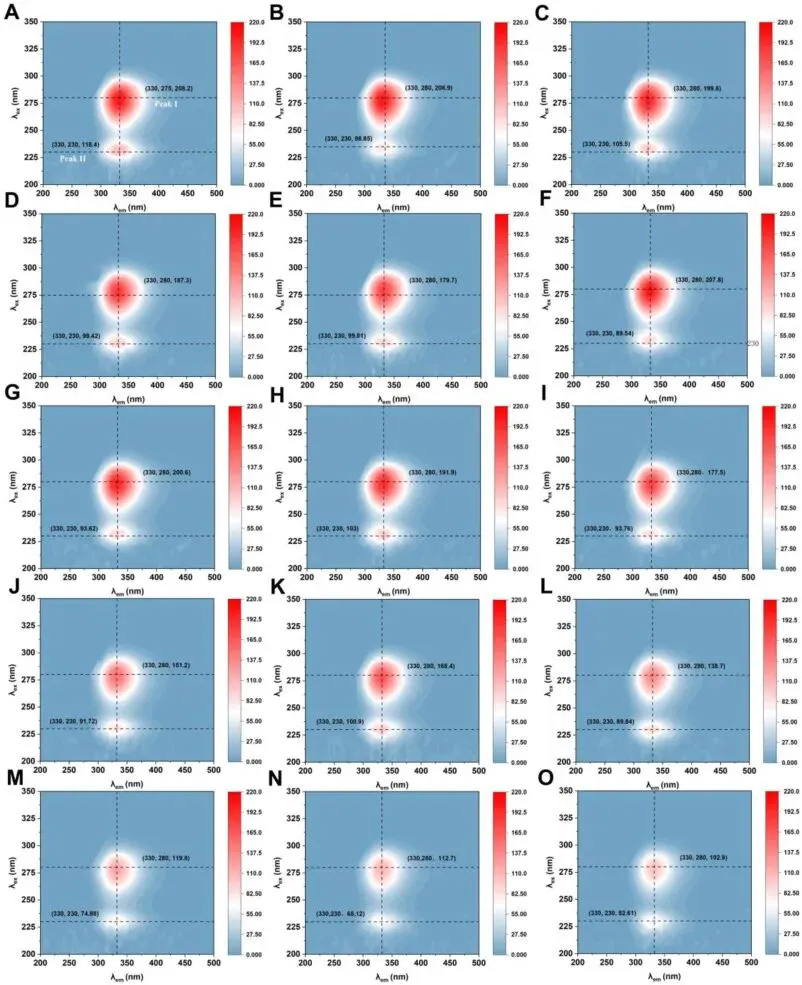 Fig. 5. EEM spectra of EWP dispersions prepared with different SA and EP concentrations: 0% EP with 0, 0.3, 0.5, 1.5, and 2.5% SA (A-E); 1% EP with 0, 0.3, 0.5, 1.5, and 2.5% SA (F-J); and 2% EP with 0, 0.3, 0.5, 1.5, and 2.5% SA (K-O). Heatmaps of Peak I intensity (P) and Peak II intensity (Q) extracted from the EEM spectra.