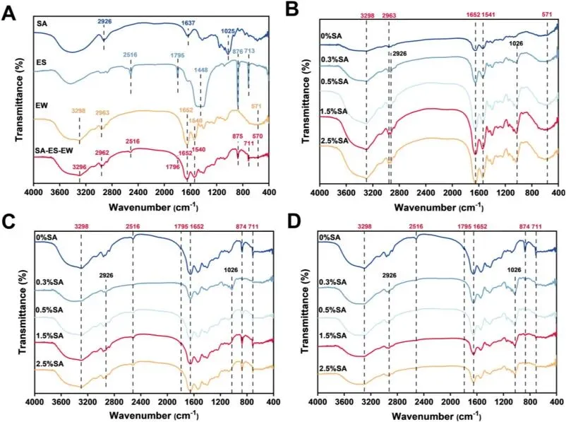 Fig. 6. FTIR spectra of SA, EWP, and EP as single components (A), and FTIR spectra of EWP dispersions prepared with different SA concentrations (0, 0.3, 0.5, 1.5, and 2.5%) in the presence of 0% EP (B), 1% EP (C), and 2% EP (D).
