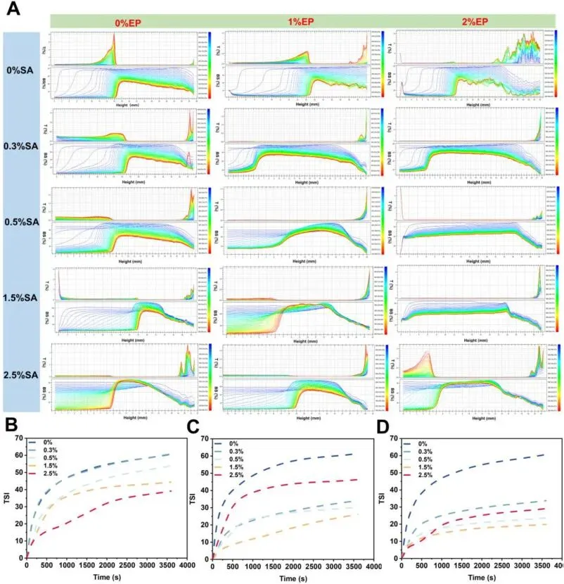 Fig. 7. Multiple light scattering profiles and TSI of foams prepared with different SA and EP concentrations. (A) Time-dependent transmittance (T%) and backscattering (BS%) profiles along sample height for foams prepared with different SA and EP concentrations. (B-D) TSI evolution of foams prepared with SA concentrations of 0, 0.3, 0.5, 1.5, and 2.5% at EP concentrations of 0% (B), 1% (C), and 2% (D).