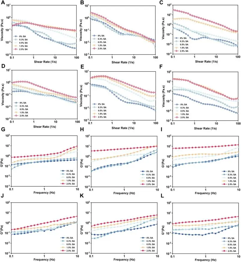 Fig. 8. Rheological properties of dispersions and foams prepared with different sodium alginate (SA) and eggshell powder (EP) concentrations. (A-C) Apparent viscosity of the dispersions prepared with SA concentrations of 0, 0.3, 0.5, 1.5, and 2.5% at EP concentrations of 0% (A), 1% (B), and 2% (C). (D-F) Apparent viscosity of the corresponding foams prepared with SA concentrations of 0, 0.3, 0.5, 1.5, and 2.5% at EP concentrations of 0% (D), 1% (E), and 2% (F). (G-I) Storage modulus (G′) and loss modulus (G″) of the dispersions prepared with SA concentrations of 0, 0.3, 0.5, 1.5, and 2.5% at EP concentrations of 0% (G), 1% (H), and 2% (I). (J-L) Storage modulus (G′) and loss modulus (G″) of the corresponding foams prepared with SA concentrations of 0, 0.3, 0.5, 1.5, and 2.5% at EP concentrations of 0% (J), 1% (K), and 2% (L).