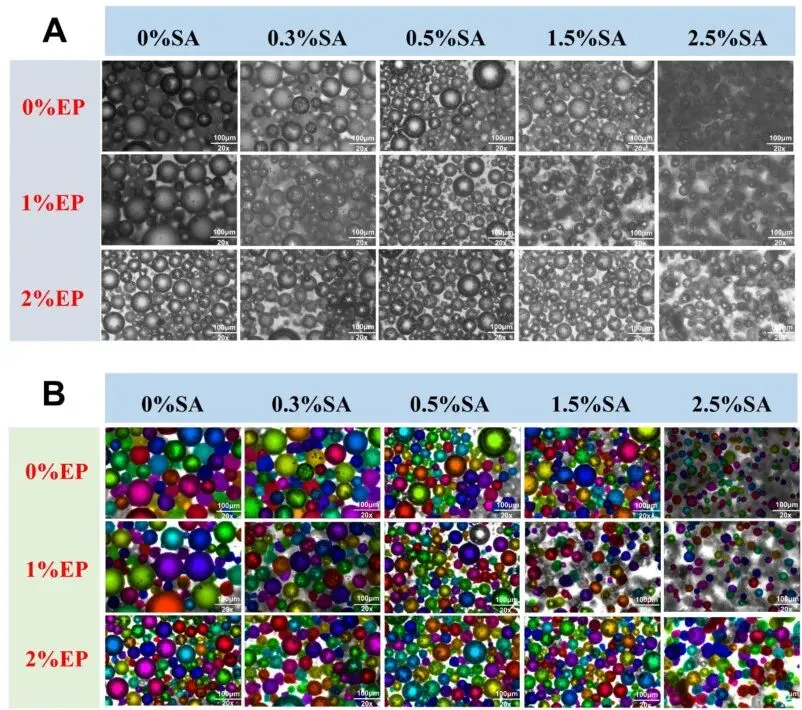 Fig. 11. Representative optical micrographs of foams after 30 min standing prepared with different SA and EP concentrations (A), and the corresponding segmented images processed by the deep learning-based Cellpose algorithm for bubble identification and size analysis (B).