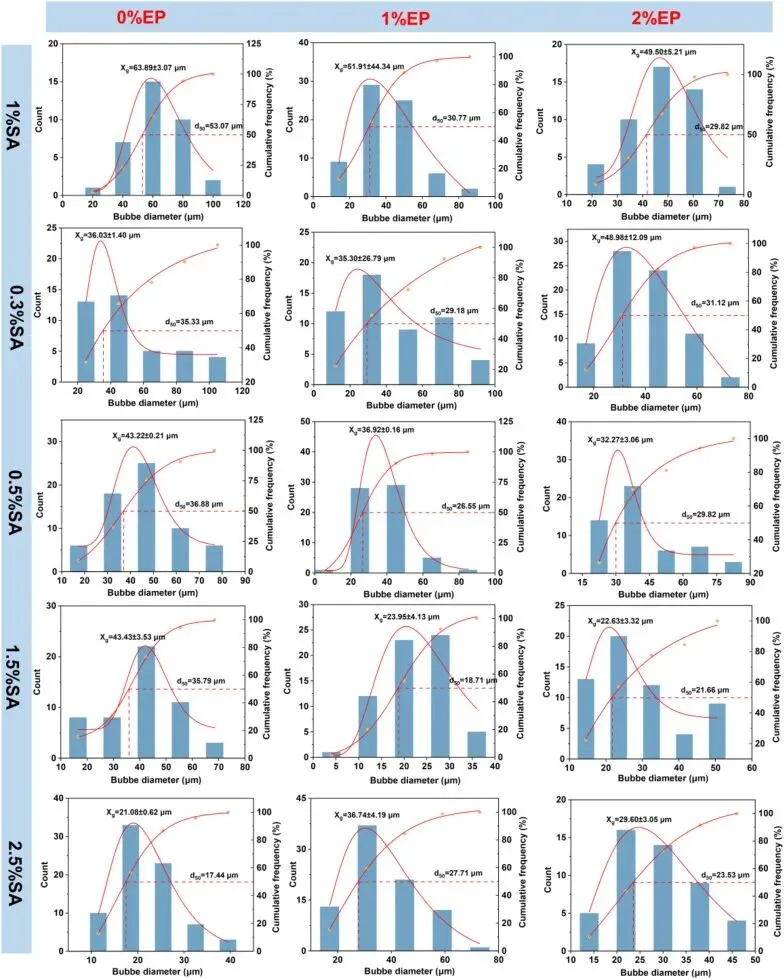 Fig. 10. Bubble number and diameter distributions of freshly prepared foams (0 min) formulated with different SA and EP concentrations, quantified from optical micrographs using ImageJ after bubble identification/segmentation. Histograms show bubble counts as a function of diameter, and the cumulative frequency curves indicate the corresponding size distribution.