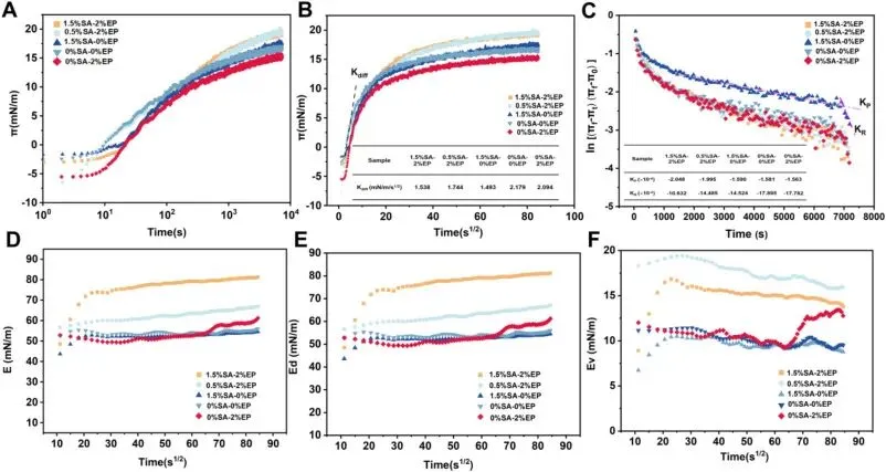 Fig. 13. Interfacial adsorption kinetics and interfacial dilatational rheology of selected EWP foams prepared with different SA-EP formulations. Interfacial pressure (π) as a function of time (A) and t1/2 (B), where the initial linear region was used to obtain the diffusion rate constant (Kdiff). (C) Ward-Tordai analysis of ln[(πf−πt)/(πf−π0)] versus time for estimating the penetration (KP) and rearrangement (KR) rate constants. Time evolution of the interfacial complex dilatational modulus (E) (D), interfacial elastic modulus (Ed) (E), and interfacial viscous modulus (Ev) (F) during adsorption.