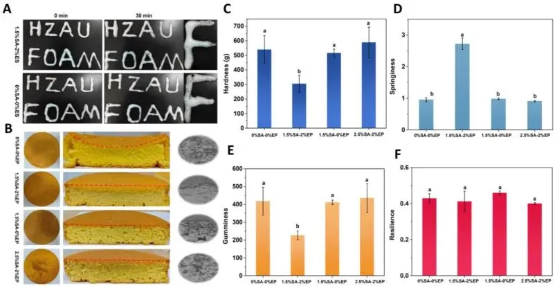 Fig. 14. Application of optimized EWP-SA-EP foams in sugar-free chiffon cakes. Representative macroscopic appearance of freshly prepared foams at 0 and 30 min for selected formulations (A). Top-view images, cross-sectional crumb morphology, and corresponding pore-structure maps of sugar-free chiffon cakes prepared with different foams (B). Texture profile analysis parameters, including hardness (C), springiness (D), gumminess (E), and resilience (F), of the resulting cakes. Different letters indicate significant differences (P < 0.05).