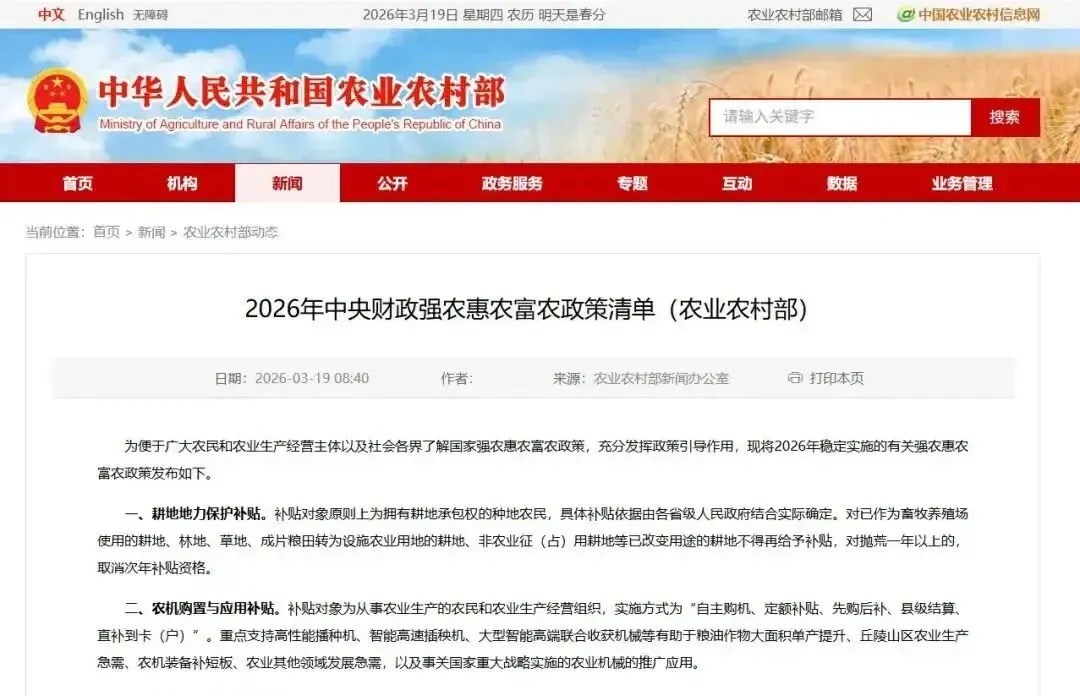 2026年是农业补贴直达机制全面落地的关键一年,中央财政持续加大投入,地方严格执行兑现,让每一分惠农资金都用在刀刃上、进到农户账上。