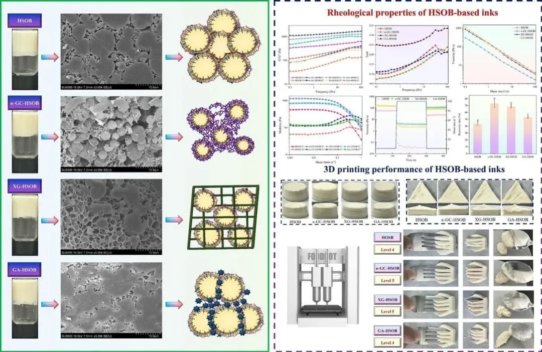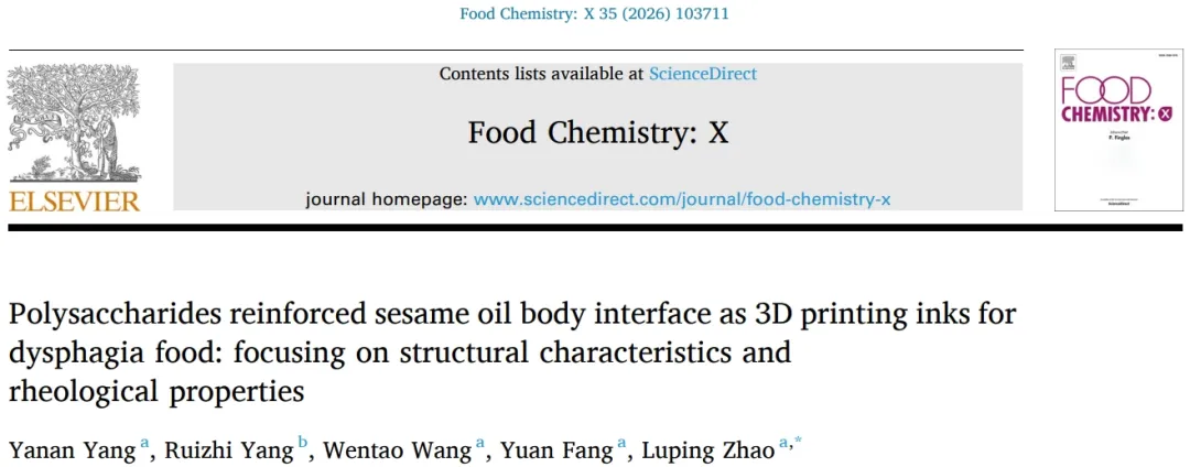 本研究以 κ- 卡拉胶、黄原胶和阿拉伯胶三种多糖改性热改性芝麻油体(HSOB),制备了适用于挤出式 3D 打印的吞咽障碍友好型食品油墨,探究了多糖类型对油墨流变学特性、微观结构及分子间相互作用的调控规律,进而明确其对 3D 打印适性的影响。结果表明,多糖类型是影响热改性芝麻油体基油墨 3D 打印性能的关键因素:κ- 卡拉胶 - 热改性芝麻油体油墨凝胶强度高、硬度大、自支撑能力优异,打印过程中变形量极小,这归因于 κ- 卡拉胶可促进二硫键、疏水作用的形成,增加蛋白质 β- 折叠结构占比,并通过吸附于芝麻油体界面推动交联网络的构建;而阿拉伯胶会导致热改性芝麻油体结构坍塌,使油墨凝胶结构劣化、3D 打印性能变差。国际吞咽障碍饮食标准化倡议(IDDSI)分级试验表明,纯热改性芝麻油体和阿拉伯胶改性油墨的打印制品为 4 级吞咽障碍食品,κ- 卡拉胶和黄原胶改性油墨的打印制品为 5 级吞咽障碍食品。本研究为提升油体基食品的 3D 打印性能、开发吞咽障碍友好型食品提供了新策略,也为特种膳食产品中功能性胶体体系的研发奠定了理论基础。赵路苹:山东农业大学食品科学与工程学院副教授,硕士生导师。研究方向:粮油副产物高值化利用、植物油体乳液调控、蛋白改性及功能性产品开发。本研究得到中国山东省重点研发计划项目(项目编号:2023TZXD009)的资助。https://doi.org/10.1016/j.fochx.2026.103711