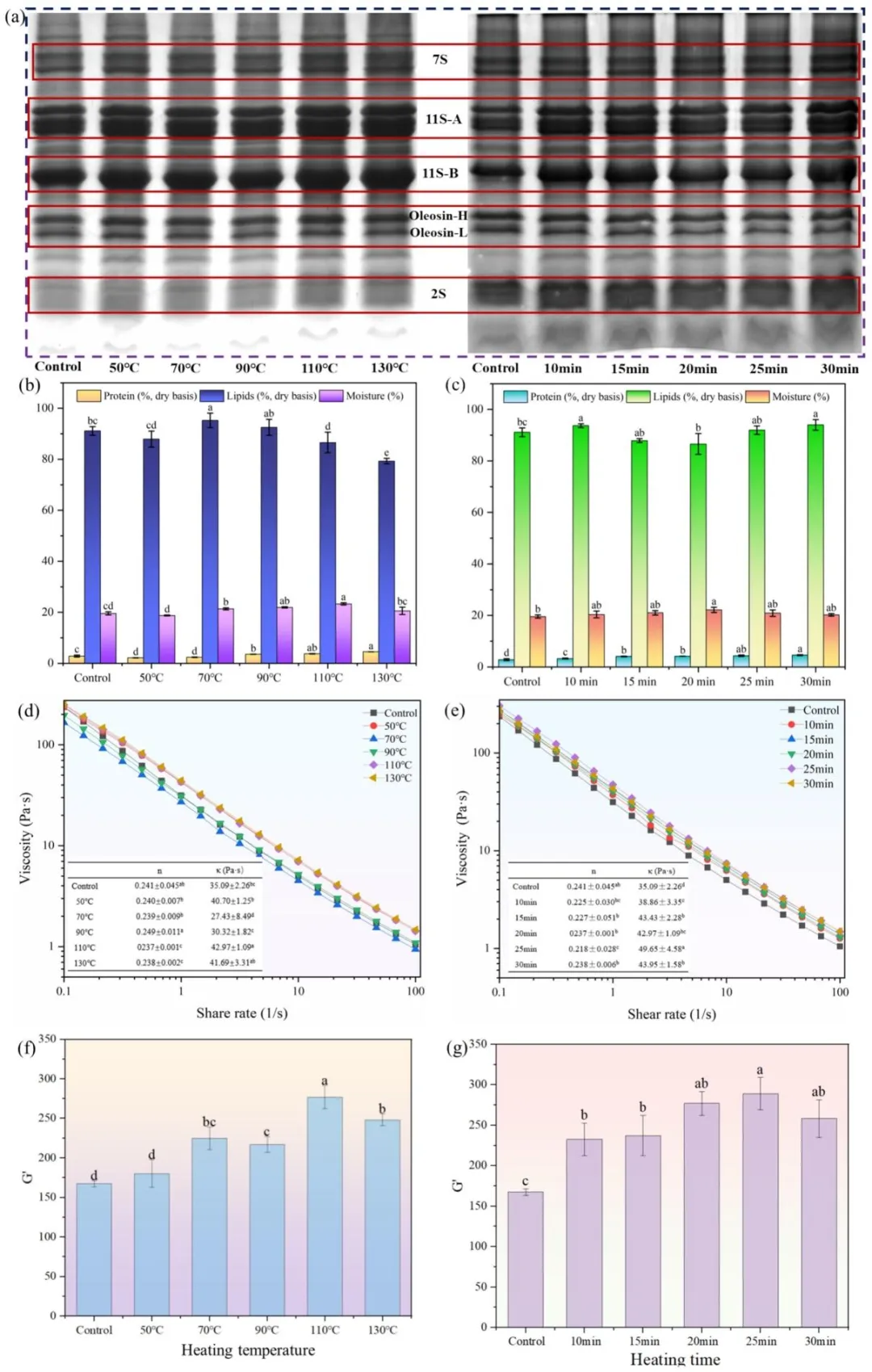 图 1 芝麻油体(SOB)与热改性芝麻油体(HSOB)的成分及流变学特性。(a) 十二烷基硫酸钠 - 聚丙烯酰胺凝胶电泳图谱;(b、c) 不同加热温度和时间下的基础成分;(d、e) 表观黏度;(f、g) 线性黏弹区的储能模量 G'。字母 a~e 表示组间存在显著差异(p<0.05)。