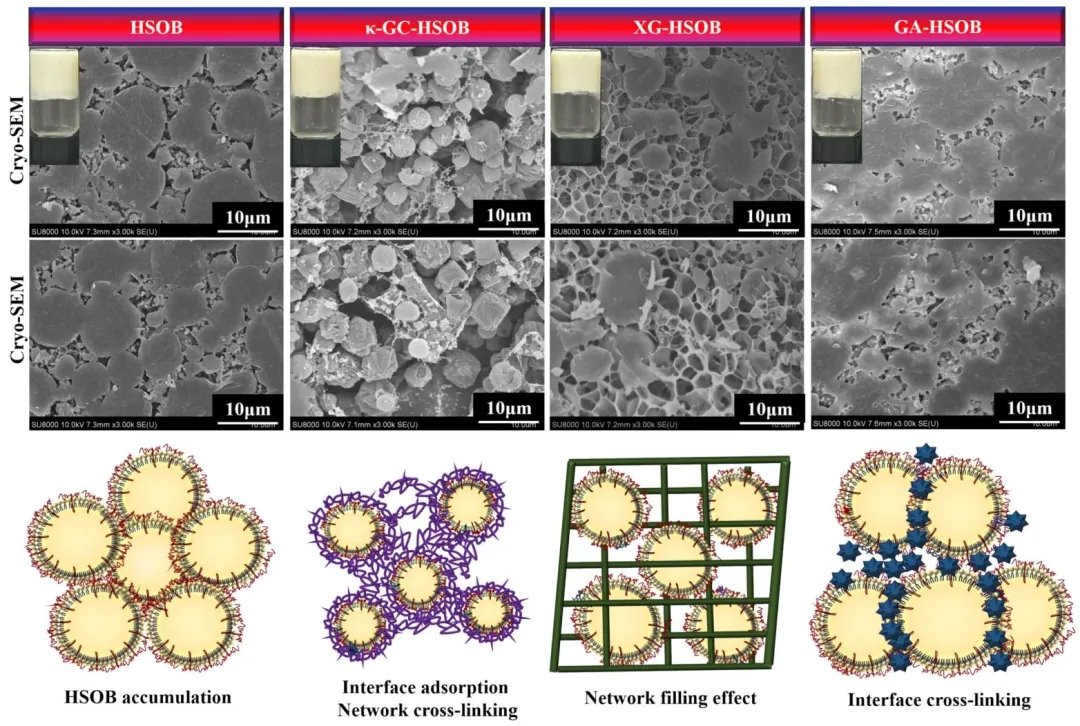 图 2 不同多糖 - 热改性芝麻油体油墨的冷冻扫描电镜图及结构模型。比例尺为 10 微米。